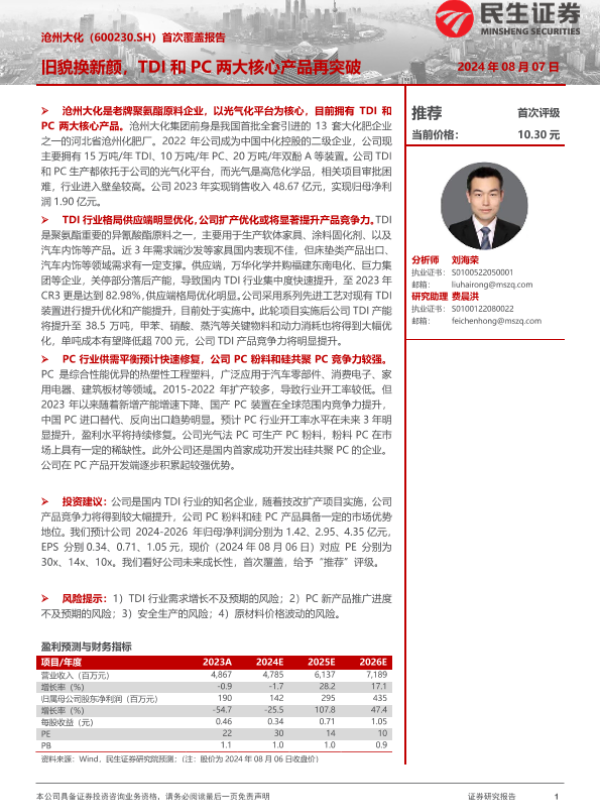 【民生证券】【20240807】沧州大化(600230)首次覆盖报告:旧貌换新颜,TDI和PC两大核心产品再突破-26页 行业研究