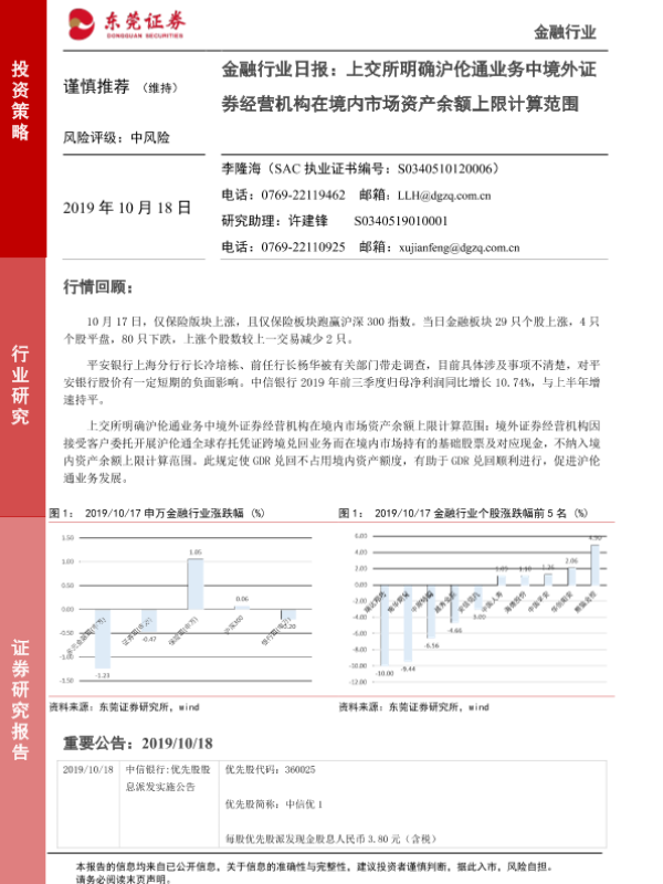 【东莞证券】【20191018】金融行业日报:上交所明确沪伦通业务中境外证券经营机构在境内市场资产余额上限计算范围-4页 行业研究