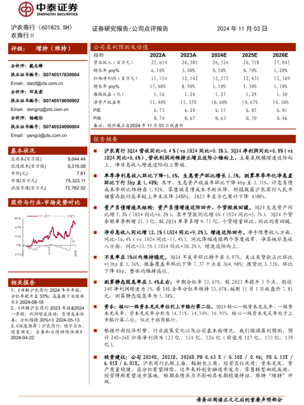 【中泰证券】【20241103】沪农商行(601825)详解沪农商行2024三季报:业绩增速改善;个贷增长回暖-11页 行业研究