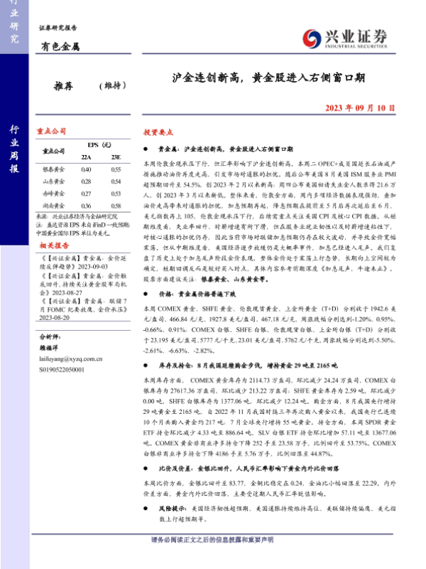 【兴业证券】【20230910】20230910-兴业证券-有色金属行业周报:沪金连创新高,黄金股进入右侧窗口期-18页 行业研究