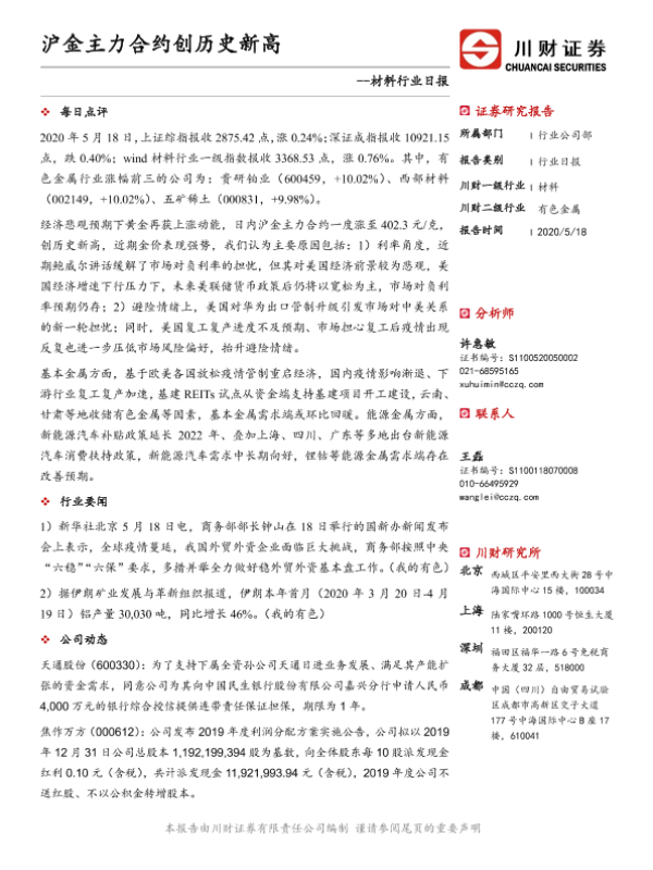 【川财证券】【20200518】材料行业日报:沪金主力合约创历史新高-3页 证券期货研究报告