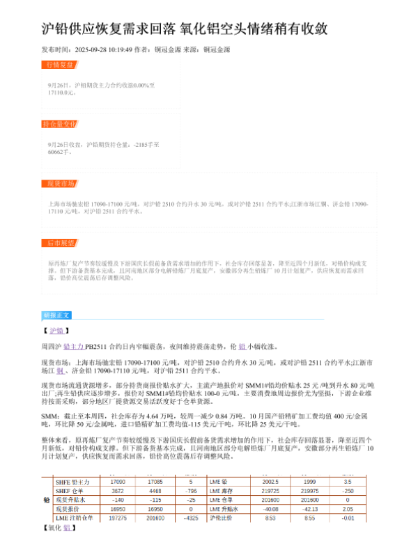 【铜冠金源期货】【202509】沪铅供应恢复需求回落 氧化铝空头情绪稍有收敛-2页 证券期货研究报告