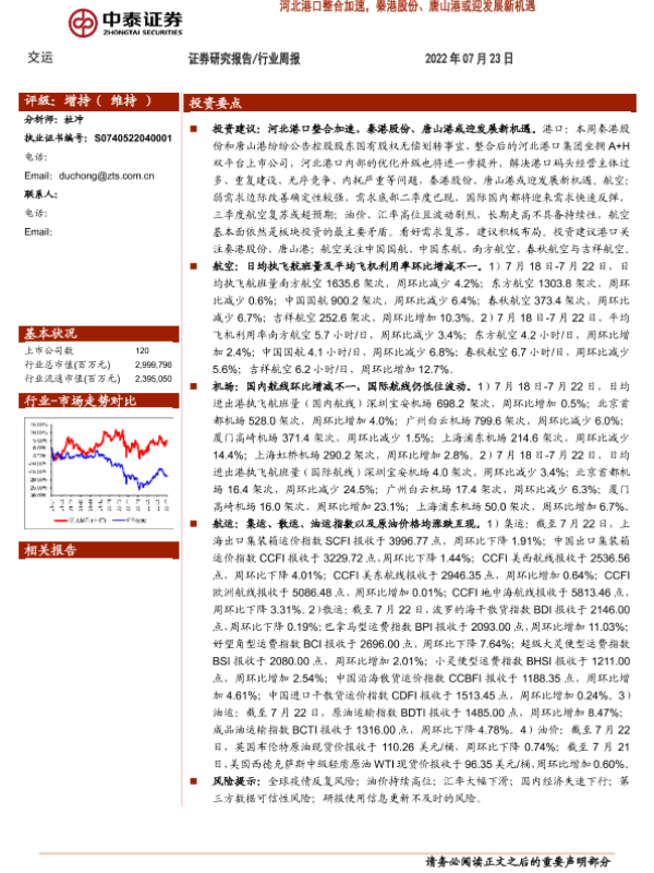 【中泰证券】【20220723】交运行业周报:河北港口整合加速,秦港股份、唐山港或迎发展新机遇-33页 行业研究