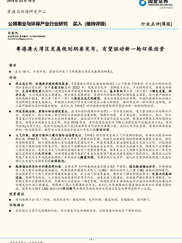 【国金证券】【20190218】粤港澳大湾区发展规划纲要发布有望驱动新一轮环保投资-3页 行业研究