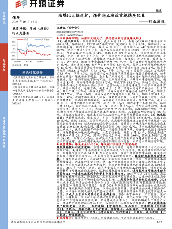 【开源证券】【20250615】油煤比大幅走扩_煤价拐点渐近重视煤炭配置-27页 行业研究