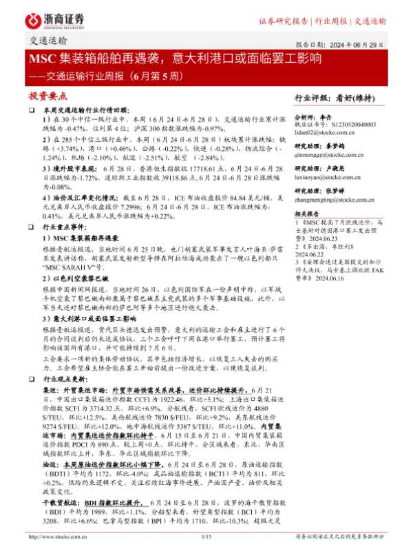 【浙商证券】【20240629】MSC集装箱船舶再遇袭,意大利港口或面临罢工影响-15页 行业研究