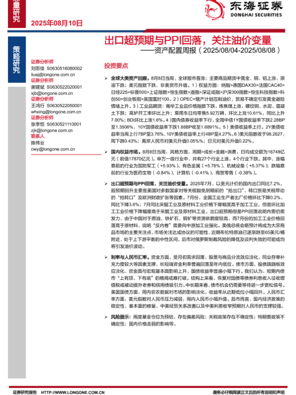 【东海证券】【20250810】资产配置周报:出口超预期与PPI回落,关注油价变量-24页 证券期货研究报告