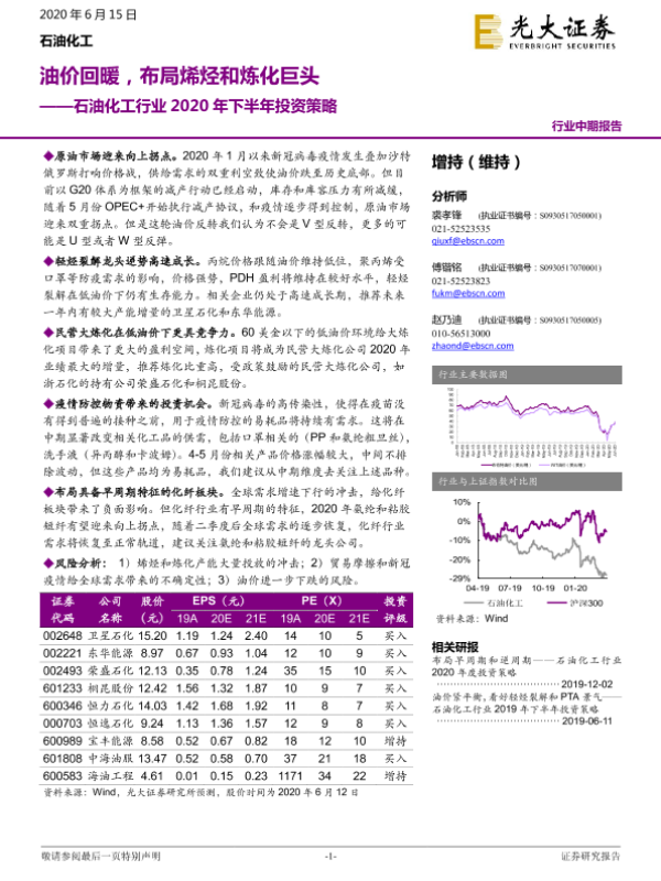 【光大证券】【20200615】石油化工行业2020年下半年投资策略:油价回暖,布局烯烃和炼化巨头-28页 行业研究
