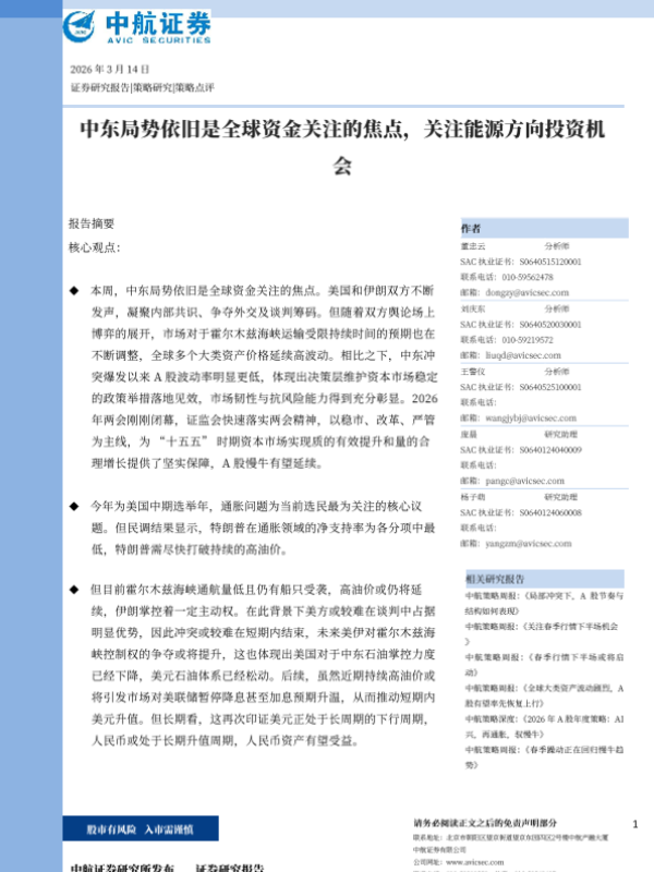 【中航证券】【202603】中东局势依旧是全球资金关注的焦点,关注能源方向投资机会-9页 证券期货研究报告