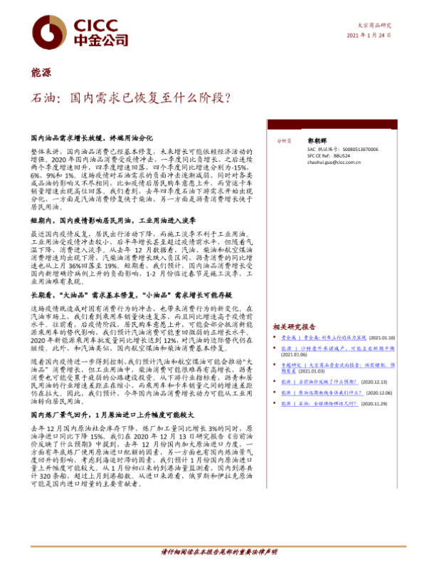 【中金公司】【20210124】能源:石油:国内需求已恢复至什么阶段?-5页 行业研究