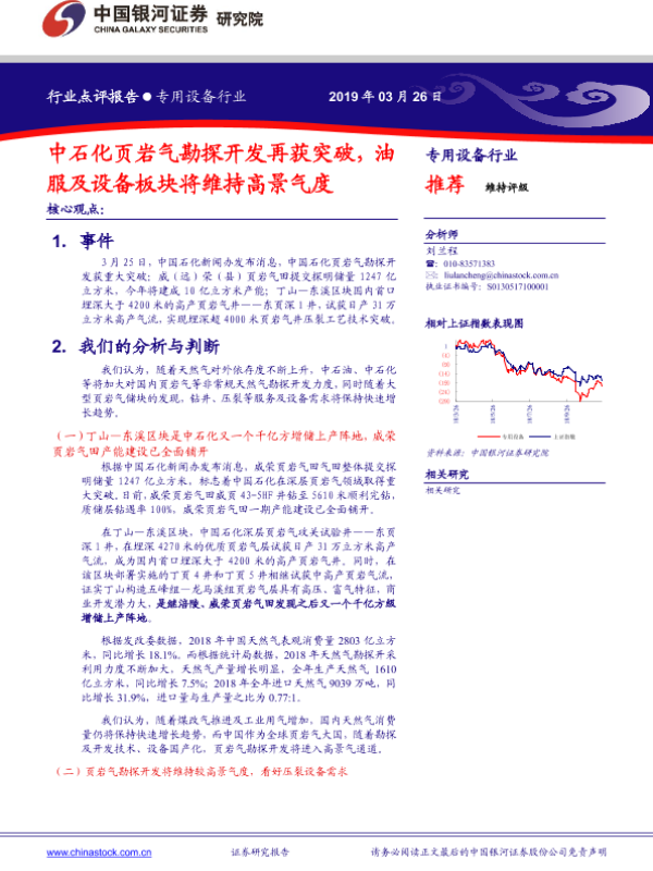 【银河证券】【20190326】专用设备行业:中石化页岩气勘探开发再获突破,油服及设备板块将维持高景气度-4页 行业研究
