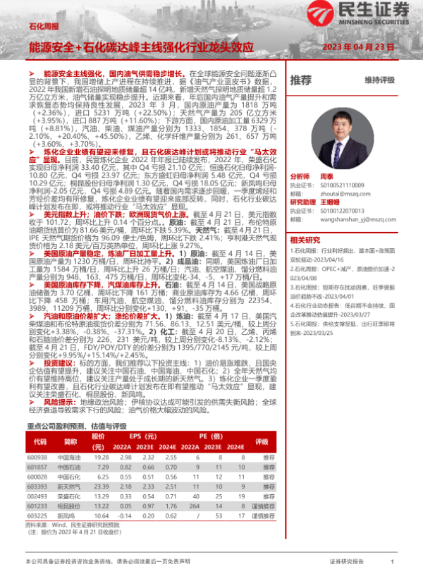 【民生证券】【20230423】20230423-民生证券-石化周报:能源安全+石化碳达峰主线强化行业龙头效应-32页 行业研究