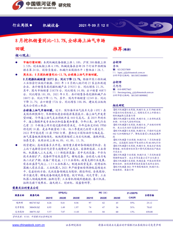 【银河证券】【20210912】20210912-中国银河-机械设备行业周报:8月挖机销量同比-13.7%,全球海上油气市场回暖-14页 行业研究