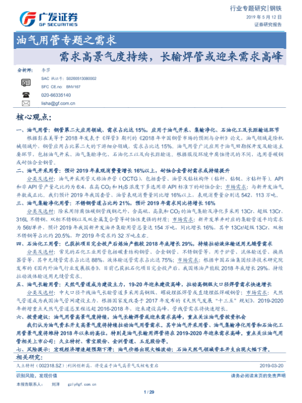 【广发证券】【20190512】油气用管专题之需求:需求高景气度持续,长输焊管或迎来需求高峰-29页 行业研究