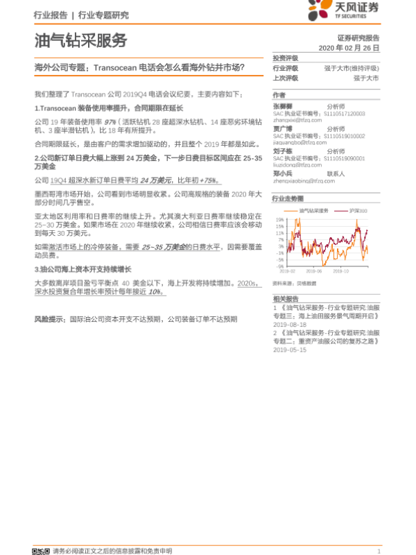 【天风证券】【20200226】油气钻采服务行业专题研究:海外公司专题:Transocean电话会怎么看海外钻井市场?-9页 行业研究