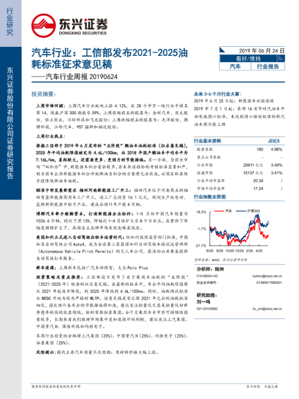 【东兴证券】【20190624】汽车行业周报:工信部发布2021-2025油耗标准征求意见稿-14页 行业研究