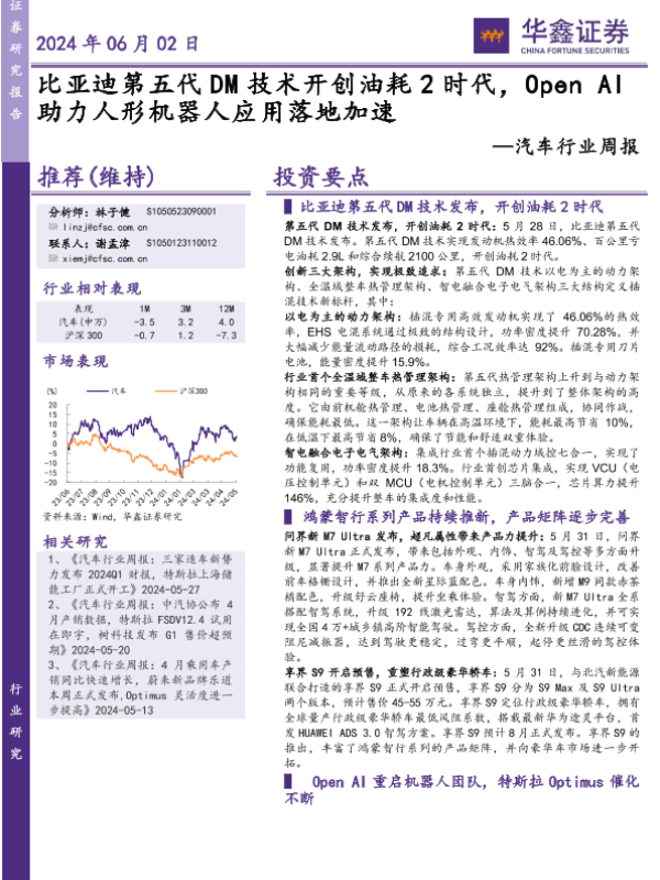 【华鑫证券】【20240602】20240602-华鑫证券-汽车行业周报:比亚迪第五代DM技术开创油耗2时代,Open AI助力人形机器人应用落地加速-15页 行业研究