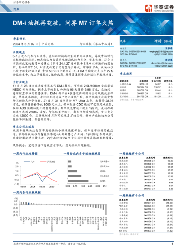 【华泰证券】【20240602】20240602-华泰证券-汽车行业周报(第二十二周):DM-i油耗再突破,问界M7订单火热-20页 行业研究