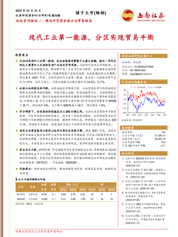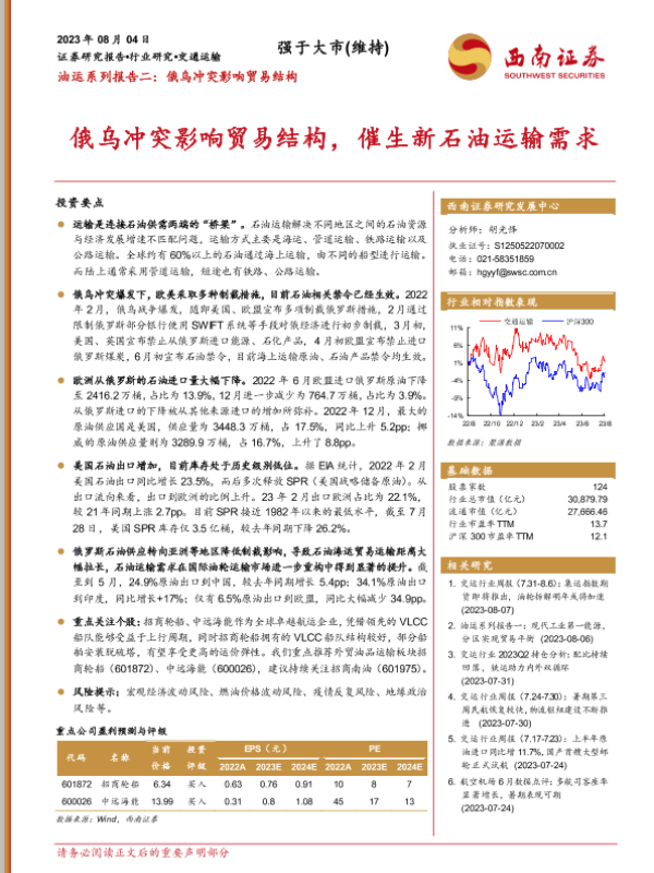 【西南证券】【20230804】油运系列报告二:俄乌冲突影响贸易结构,催生新石油运输需求-15页 行业研究