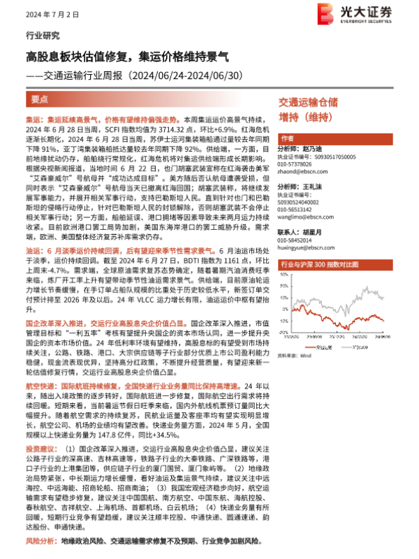 【光大证券】【20240702】交通运输行业周报:高股息板块估值修复,集运价格维持景气-16页 行业研究