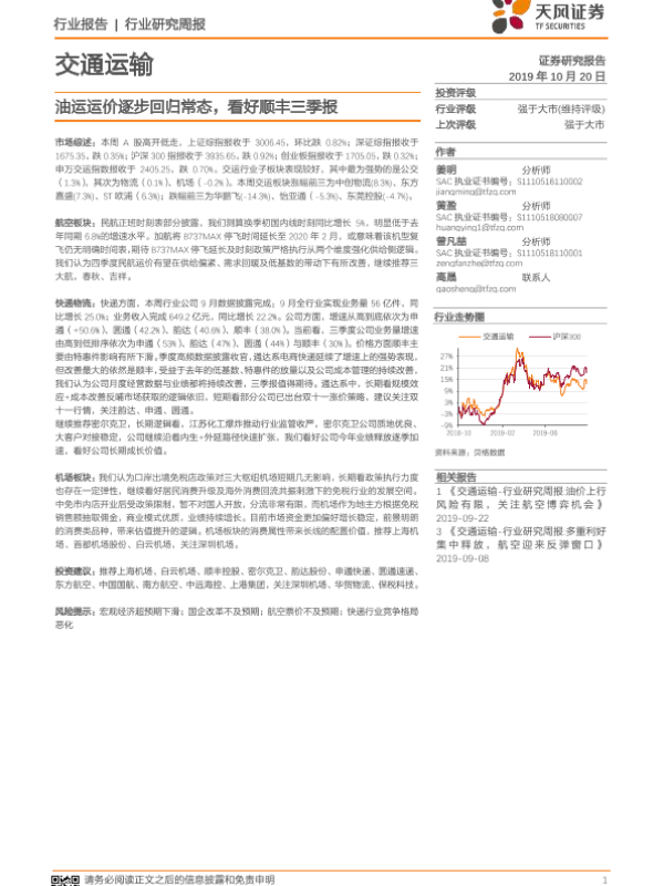 【天风证券】【20191020】交通运输行业研究周报:油运运价逐步回归常态,看好顺丰三季报-18页 行业研究