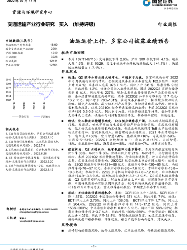 【国金证券】【20220717】油运运价上行,多家公司披露业绩预告-15页 行业研究
