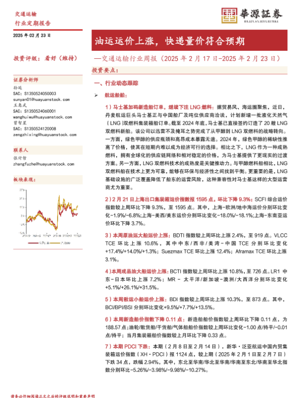 【华源证券】【20250223】交通运输行业周报:油运运价上涨,快递量价符合预期-15页 行业研究