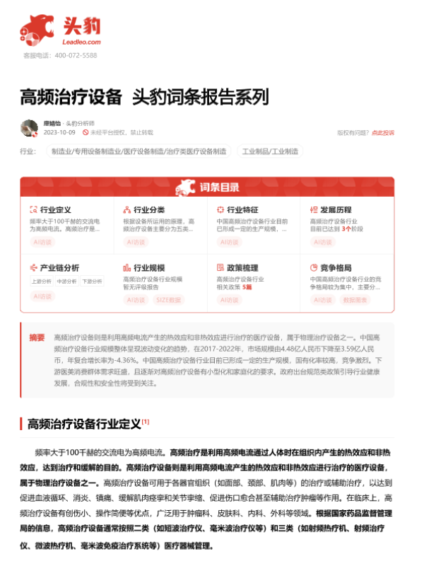 【头豹研究院】【20231009】高频治疗设备 头豹词条报告系列-17页 行业研究