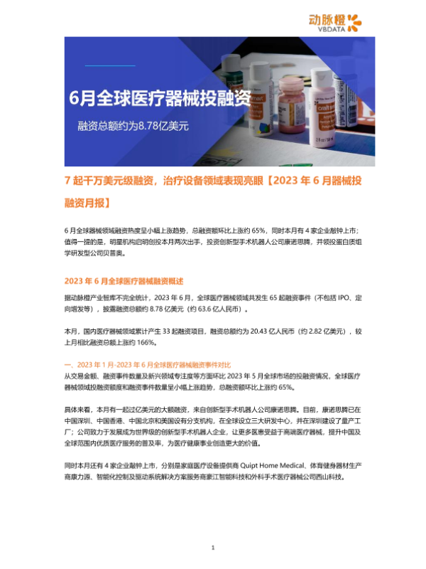 【动脉橙产业智库】【202306】7起千万美元级融资,治疗设备领域表现亮眼【2023年6月器械投融资月报】-6页 行业研究