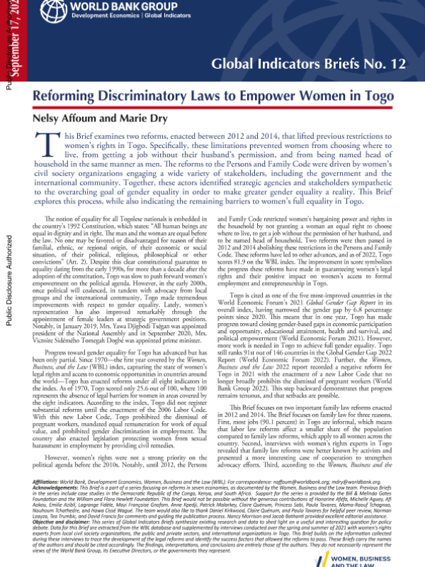 【World Bank】【2025】Reforming Discriminatory Laws to Empower Women in Togo-6页 政策文件