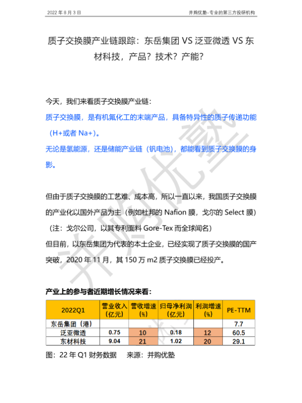 【并购优塾】【20220803】并购优塾-质子交换膜产业链跟踪:东岳集团VS泛亚微透VS东材科技,产品?技术?产能?-31页 行业研究