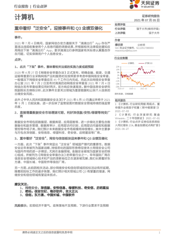 【天风证券】【20210705】20210705-天风证券-计算机行业点评:重申看好“泛安全”,迎接事件和Q3业绩双催化-2页 行业研究