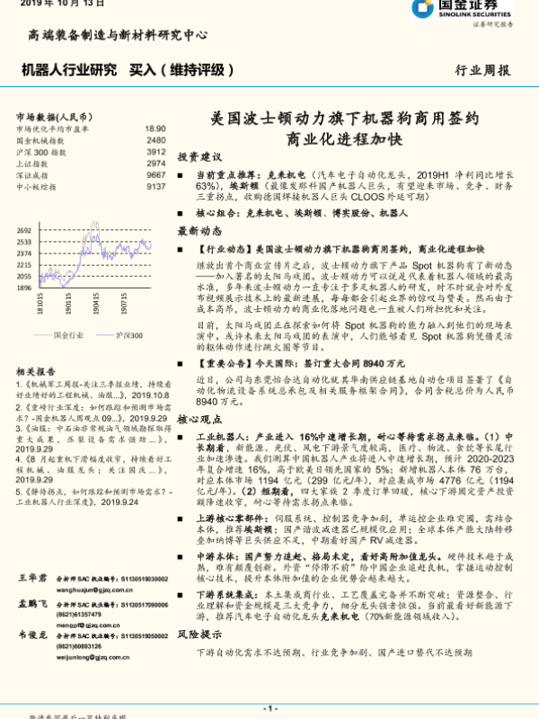 【国金证券】【20191013】20191013-国金证券-机器人行业研究周报:美国波士顿动力旗下机器狗商用签约 商业化进程加快-12页 行业研究