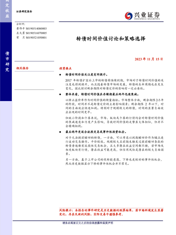 【兴业证券】【20231115】转债时间价值讨论和策略选择-20页 行业研究