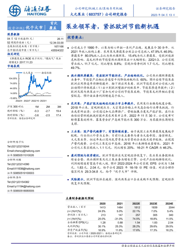 【海通证券】【20230413】大元泵业-603757.SH-泵业领军者,紧抓欧洲节能新机遇-20页 行业研究