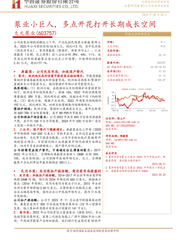【华西证券】【20230926】大元泵业-603757.SH-泵业小巨人,多点开花打开长期成长空间-31页 行业研究