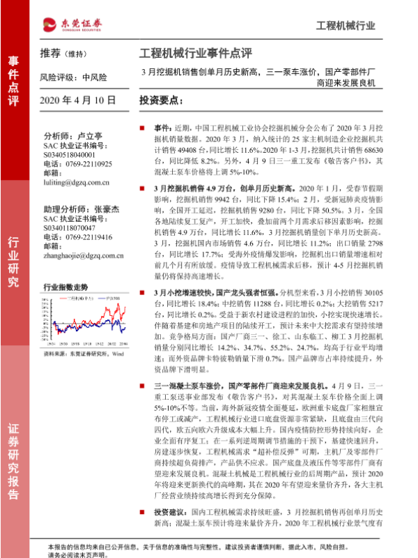 【东莞证券】【20200410】20200410-东莞证券-工程机械行业事件点评:3月挖掘机销售创单月历史新高,三一泵车涨价,国产零部件厂商迎来发展良机-3页 行业研究