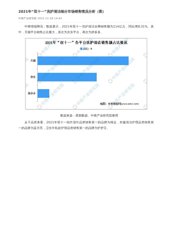 【中商产业研究院】【20211118】2021年“双十一”洗护清洁细分市场销售情况分析(图)-2页 市场调研