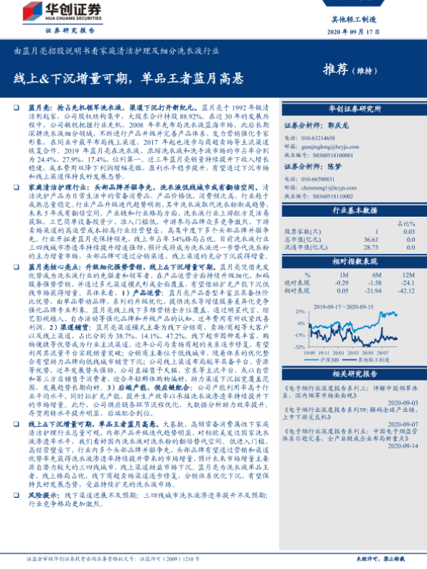 【华创证券】【20200917】由蓝月亮招股说明书看家庭清洁护理及细分洗衣液行业:线上&下沉增量可期,单品王者蓝月高悬-36页 行业研究
