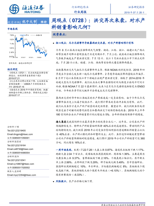 【海通证券】【20190728】周观点(0728):洪灾再次来袭,对水产料销量影响几何?-8页 行业研究