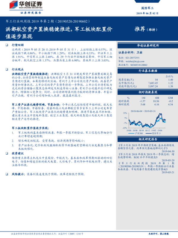 【华创证券】【20190602】军工行业双周报2019年第2期:洪都航空资产置换稳健推进,军工板块配置价值逐步显现-17页 行业研究