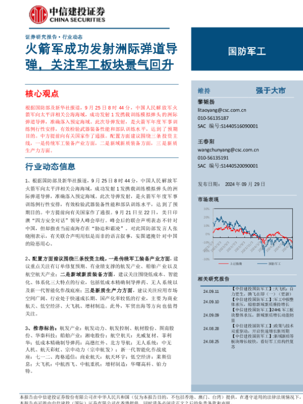 【中信建投证券】【20240929】2024年10月13日更新-【中信建投】国防军工行业:火箭军成功发射洲际弹道导弹,关注军工板块景气回升-26页 行业研究