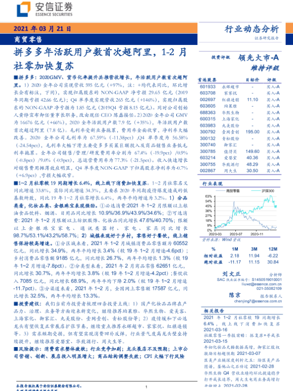 【安信证券】【20210321】商贸零售行业:拼多多年活跃用户数首次超阿里,1-2月社零加快复苏-15页 行业研究