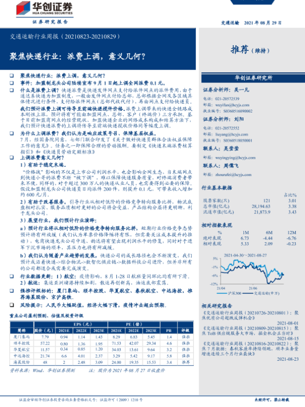 【华创证券】【20210829】交通运输行业周报:聚焦快递行业:派费上调,意义几何?-17页 行业研究