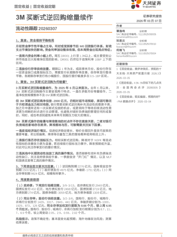 【天风证券】【202603】3M买断式逆回购缩量续作-21页 证券期货研究报告