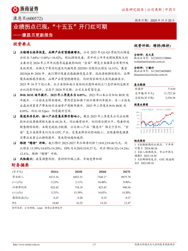 【浙商证券】【202511】业绩拐点已现,“十五五”开门红可期——康恩贝更新报告-3页 证券期货研究报告