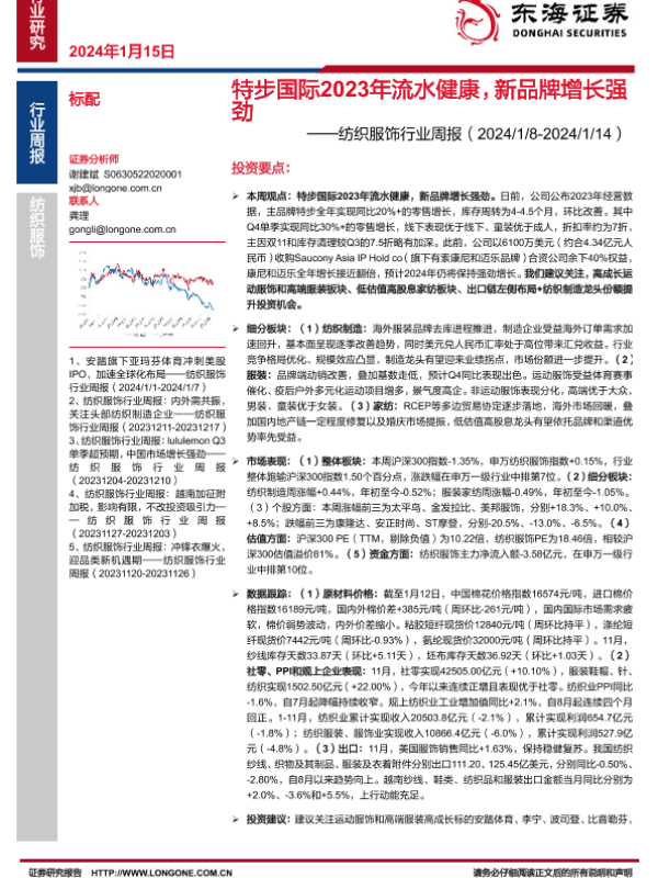 【东海证券】【20240115】20240115-东海证券-纺织服饰行业周报:特步国际2023年流水健康,新品牌增长强劲-12页 行业研究