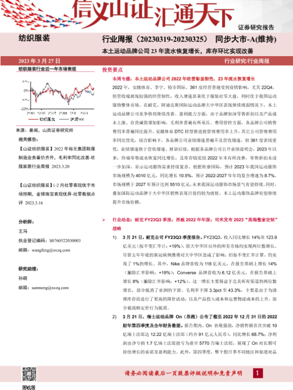 【山西证券】【20230327】纺织服装行业周报:本土运动品牌公司23年流水恢复增长,库存环比实现改善-32页 行业研究