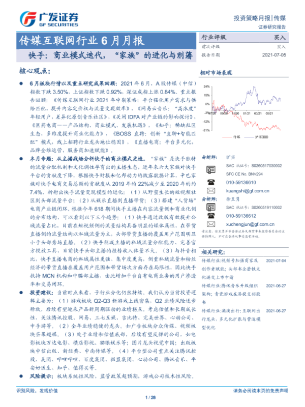 【广发证券】【20210705】传媒互联网行业6月月报:快手,商业模式迭代,“家族”的进化与削藩-28页 行业研究