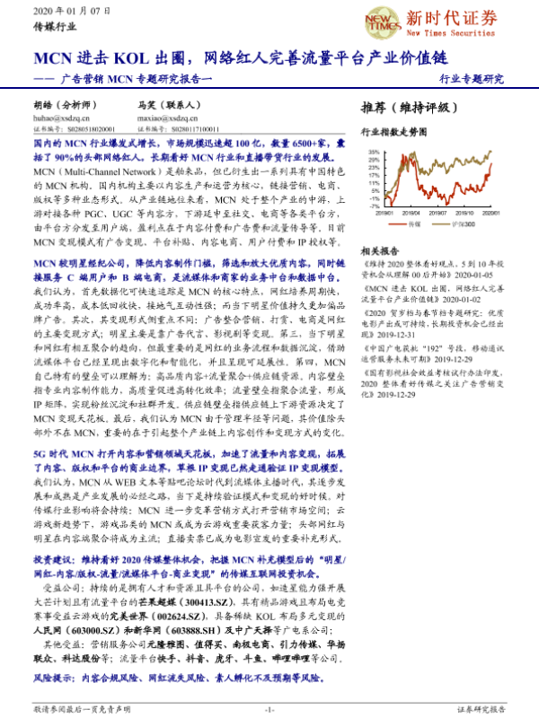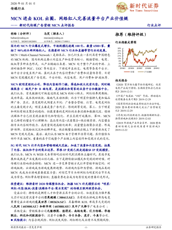 【新时代证券】【20200101】新时代传媒广告营销MCN点评报告:MCN进击KOL出圈,网络红人完善流量平台产业价值链-3页 行业研究